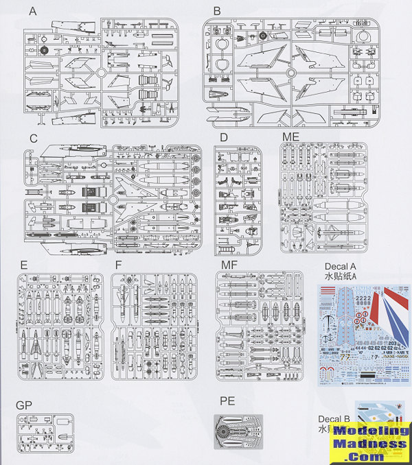 A separate windscreen and canopy are provided. There is also a boarding ladder with shallow recesses provided in the nose for its attachment. There are more 'things under wings' than you will use. In the mix are fuel tanks, a centerline recce pod, a buddy fuel tank, FLIR pod, chaff dispenser, ECM pods, Magic AAMs, Exocet, AS-30, GBU-12s, 68mm rocket pods and some other bits. Several of these have unique pylons and those are also included. A