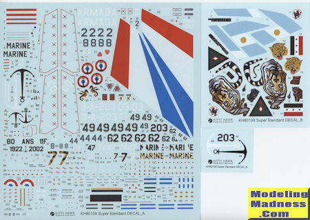 Markings are included for eight planes that cover all the schemes worn by the Super Etendard. There are two that are not French and those include an Argentine plane from the Falklands War and an Iraqi aircraft used during the 'tanker war' portion of the Iran/Iraq war. Three of the French planes are Tiger Meet aircraft in various levels of complexity. One is an 80th Anniversary plane with the blue, white and red tail. Then there is the box art plane and one that participated in ISAF during 2007 in an overall light grey. The decals are nicely printed and have been shown to be VERY thin so one needs to be careful when using them.