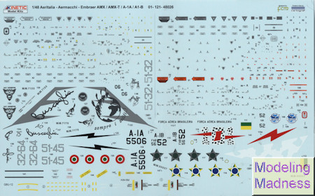 Instructions are fairly well drawn with incomplete color information provided during the construction process. For instance, they note that the instrument panel and forward anti-glare shield are "33", but there is no indication as to the color of the interior or the seats. Gear legs and well interior is "34" and that is about it. There is color info for the overall build. You can build one Italian or one Brazilian plane. The huge decal sheet covers both the single and twin seat planes so most of the markings are not used. There is a full data placement guide provided for the Italian plane and one for the Brazilian aircraft. The decals are very nicely printed by Cartograf and researched by FCM. Fortunately, both FCM and Caracal have produced sheets for the AMX so you have other options out there.