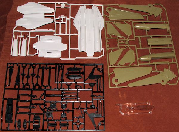 The cockpit consists of a tub, two seat shapes, two crew members and two instrument panels. The forward fuselage is split vertically and the rear, horizontally. There is a lower forward fuselage section that contains the nose gear well and a small forward radome piece. Wings are upper and lower sections that are designed to mesh together with the help of a plastic track section that activates the small glove vanes on the leading edge of the wing. To my knowledge, only the even older Monogram 1/72 Tomcat has the feature.