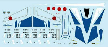 Instructions are nicely done and entirely in Japanese. In fact, actual construction drawings only take up about 2/3 of one of the four pages. Markings are provided for any of the six different planes. Decals have both white and blue bits on them, though the modeler will need to paint the underside of the wings and lower fuselage in blue (a color that has to be mixed). I have been informed that the blue on the decals may be the wrong shade so perhaps painting all the blue bits will be the wisest choice. Paint information is with Gunze paints, a brand that is no longer available in the US for its acrylic line-up. Decals are superbly printed by Cartograf so you know you'll be getting the best.