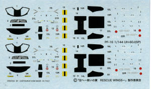 The kit instructions are very well done and unfortunately for some of us, entirely in Japanese. They provide color references in Gunze, Tamiya and Model Master paints. There are also several notes about which I've no idea what they are referring. The main construct is an exploded view of the parts with a four view showing where some of the smaller photo etch bits are located. This latter set of drawings is very helpful. There are markings for two helos, the only difference being the serial number. Both are in a dark and medium blue scheme that is popular with the maritime crowd. The decals are very nicely printed and the placement guide is duplicated on the back of the box in full color. The sheet also includes the walk areas and the black surround to the nose section.