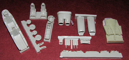 There is more resin than styrene in this one in terms of parts with basically just the airframe and landing gear in plastic. Even then, the main gear well and speed brake section are resin. Plastic is nicely formed, with only somewhat thick seam lines to show its short run origins. Surface detail is superbly done with finely and crisply engraved lines. Resin takes care of all the details along with a very nicely done color photo etch fret. The cockpit includes well molded bang seats with resin control sticks that fit into a resin tub.