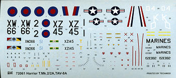 ircraft Grey. I believe these were initially glossy but later a more matte color. The demarcation lines were pretty tight. The various radome panels are in a dark tan, though these did tend to fade with time. For the RAF, you have a plane from 233 OCU in July 1975 and one with 3 Squadron in 1976. The 233 OCU has the original short fin. The TAV-8A is with VMAT-203 in 1976. While the box work says it was assigned to the USS FDR, that is not on the aircraft and this ship was only used for sea trials for students. Decals are superbly printed and include the bevy of data markings. In fact, the instructions devote two pages to data placement.