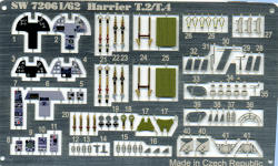 This Sword Harrier T.2 is not the only two seat Harrier ever injection molded. Heller did one of their snap kits of the T.4 many years back. Being a snap kit, it was a decent basic outline, but lacking in detail. Not so this Sword kit. Thanks to a color photo etch fret, there is oodles of small details. Most of these small bits are for the canopy, interior or the myriad of antennas that these planes carry. I would guess the fret is done by Eduard, but that is only a guess. Like some earlier injected Harriers, the exhaust nozzles on this one are a single casting. This is something I prefer as it eliminates what is often a troublesome seam, though detail may be a bit shallower because of it.