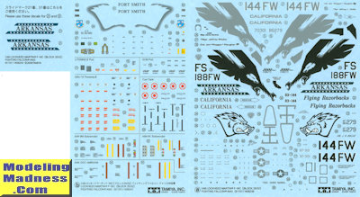 Instructions are well done with the usual Tamiya-only paint references. These should all be in the simplified two grey scheme, but are shown in the older three-greys version. Take your pick. Two of the planes are from the 194 FS, California ANG from 2006/7. Both are 144 FW boss birds. The 2006 option is a block 25 with a standard color fin and the 2007 version is a block 32 as shown on the box art with a black fin. The third option is from the 188 FW, Arkansas ANG with a red fin. This aircraft is a block 32 from 2006. Decals are nicely done with all the markings you'd need for both the plane and the various stores.