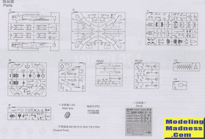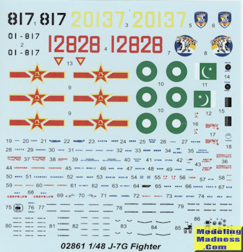 Instructions are well drawn, though have their idiosyncrasies. Any paints mentioned are either generic or Gunze. Markings are for three planes. One is the box art plane in an overall light grey. Interestingly, the full color painting and markings diagram shows the gear wells painted in a darkish green. Another Chinese plane is shown in a darker grey with a Pakistani plane in two greys such as you'd see on an F-16. The painting and markings guide shows a variety of manufacturers for colors. The decal sheet is nicely printed and glossy. The yellows look like they'd disappear on a darkish background, but use will tell if this is true or not.