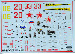 The instruction booklet has crisply drawn construction sequences with detail sections where needed. There are also indications on the variant and whether you want to build it with everything opened up or closed. Model Master paints are provided for colors with all being a similar camouflage scheme. Three different markings options are provided, all Soviet/Russian. The box art plane is a V from 1988 in Afghanistan, hence the additional exhaust shrouds. There is one standard V from 1982 and one of the two dozen VP aircraft from 2001 with the Russian Baltic Fleet. Decals are very nicely done and include instrument panels for the cockpit, as well as data markings for the helo and armament.
