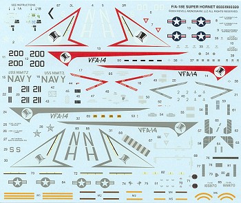Instructions are excellent with very well drawn instructions and color information in generic and FS 595 references. Markings are provided for two aircraft from VFA-14; one the CAG bird with the additional black bits and the other a standard 'line bird'. The sheet is well printed and my experience with newer Revell decals has been quite positive. The sheet includes full stencils and the IR slime lights as well as weapons markings.