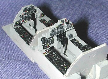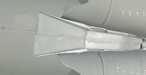 During this time, I also glued on the avionics bay cooling scoops and used some filler to smooth them out. I also removed the reinforcement 'arrows' from the stabilators. Other things done were to assemble the seats after painting the frames black and the center sections a dark grey. It would be nice to at least include decals for the seat harness, but apparently Hasegawa plans on us using the crew figures that are supplied with the kit. Most of you will undoubtedly replace the seats with resin ones of a higher detail level, but the kit supplied ones are not that bad. I also installed the flare doors in the closed position. You may want to back these up with something as they sink in a bit from the surface. These fit snugly as well and once dropped in, are pretty well there for the duration. The last thing I did was smooth out the filler applied on the nose cone.