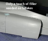 Thanks to having many other things to do today, little was accomplished. However, I did manage to sand smooth all the filler that I applied last installment. This gave me a pretty well complete main airframe. I still have to rescribe and replace the lost detail. This is a bit on the time consuming side, but it does add a lot to the finished model when it is done. There are also a couple of spots (mostly under the intakes) where a touch more filler would work out well, but I'll wait to do that after I install the cockpit and glue the lower forward fuselage in place. It is quite possible that this part will cover up some of the areas of concern. I also glued the two radome pieces together and applied filler on the seams. With a weekend coming up, I should be able to make some decent headway by next installment.