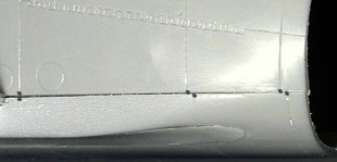 The next image shows the wings held in place and the area just aft of the wings is not totally in synch. I've placed black dots where the three panel lines end at the join, and you can clearly see that while the forward one seems lined up, the next two are not. Now it could be that this is how it is on the real aircraft, but I don't think that is the case. Though not shown, on the spine, the lines there are off a bit as well, though not as much as shown here. This means that all those circular access hatches on the spine are a bit more oval than circular.