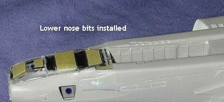 Then I installed the cockpit and lower forward fuselage fairing. The cockpit was pushed into place and when the lower fairing applied, it held the cockpit in so well that no gluing was needed. However, this lower fairing is a very tight fit and one has to be very careful when gluing to make sure that it fits properly. Once it was glued in, I pushed on the nose well to get it to line up with the fairing (which has part of the well molded into it. The molding of the new part is such that I was unable to get all the braces to line up perfectly.