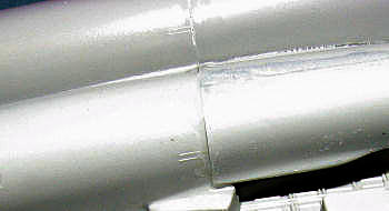 on the fins as well. Meanwhile the exhaust pieces were glued together. Take care not to sand off the alignment tabs. I also cleaned up the landing gear in preparation for painting. These are more robust than the ones on the ICM kit and perhaps less detailed as well. Next, I cut off the canopy and windscreen. A sneeze during windscreen removal caused me to take a chunk out of the side of it. No replacement, I fear so I just left it as it is. These were then masked and attached to the airframe after installing the seat. The fit is only fair with the rear of the canopy being too large to fit into the rear fuselage. By this, I mean it is too wide at the rear and too tall so it sits up above the fuselage and I'd have to widen the fuselage to get it to match the canopy cut-out width. As the fuselage is molded upper and lower, widening and raising this area would be a challenge. Strangely, it fits fine on the sills and is not too wide there.