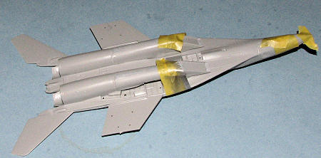 So the wings go through the sand, fill, sand routine as well until you are happy with the results or just tired of sanding. Starting to look like an aircraft now. The fins fit fairly well, lacking any positive lock for the right angle. Since Italeri does a two seat kit of this as well, the flare/chaff dispensers that fit on the front of the fin are separate, and a poor fit. More filler to blend things in there and