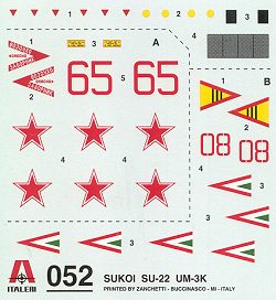 Instructions are typical of Italeri and that is to say they are very good. Color call-outs are given in several paint ranges and FS numbers. Now why Tamiya and Airfix can't do the same is totally beyond me. Though I'm sure this plane saw service with a number of air forces, the decals are provided for only two planes. One is Soviet and the other is post Cold War Hungarian. Both schemes are a multi-colored scheme that should be interesting to paint. They type was undoubtedly also flown by the Poles, East Germans, Egyptians, Peruvians, Iraqis, and several other countries. Since most of these planes were just insignia and tactical numbers, the resourceful modeler should be able to come up with something a bit different. The decals are well printed and look as if they'll work well.