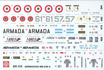 The instruction sheet is an eight page foldout with the usualhistory and warnings. One side of it shows the construction sequence and partslayout with a couple of photos to aid in construction. The other side is thehistory and decal/color chart. Four aircraft are featured on the sheet, which ismatte and slightly off register. I also believe the blue is a bit questionable.The four options are: one with the Scuola Volo Basico Iniziale Aviogetti or SVfor short in the early camo scheme. Next is one with 61 Brigata Aerea in the newgrey. An Argentine Navy version is next and finally a demonstrator for the JPATScompetition in an experimental grey scheme rounds out the selection.