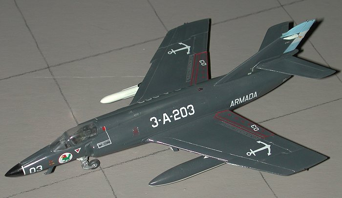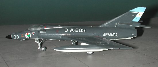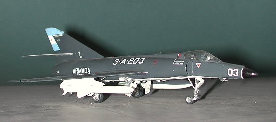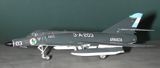 Molded in darkish grey plastic with raised panel lines, the kitfeatures positionable speed brakes as well as the Exocet missile and drop tanks.The cockpit was complete for its day with tub, seat, control stick andinstrument panel. The canopy can be displayed open if you wish but it will showa rather bare cockpit, compared to what you can get in today's kits. I don'tremember if folding wing tips were an option, but they wouldn't be difficult todo.