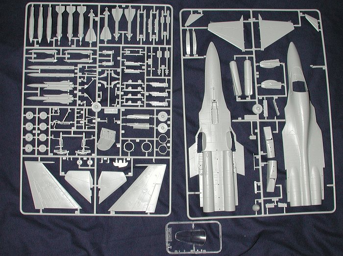Areal highlight of this kit are the weapons that are provided. You have a nicechoice of bombs, rockets and missiles to put on the various hardpoints of thekit. What are especially nice are the large ramjet powered missiles that fitunder the intakes. These same missiles are used by the US Navy as targets andcarried by QF-4s. Now if this missile was only available in 1/48 as well!