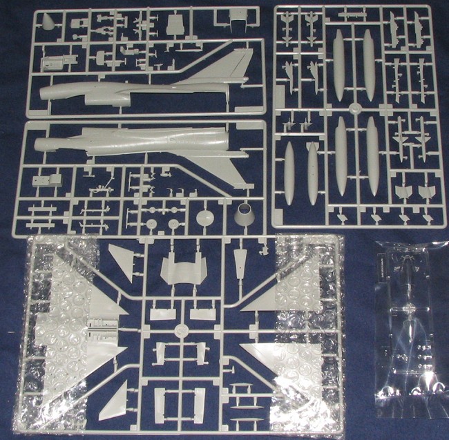 A full sprue is dedicated to the stuff that hangs from the wings, meaning PL-8 and PL-10 missiles and various drop tanks. Separate flaps and ailerons are provided, though it seems they are not really designed to be positioned in anything but the neutral position as the flap actuator assemblies will prevent this. The intake is a bit shallow with a blanking plate provided to prevent you from peering down the intake. an optional position canopy with actuating arm is given. Interior is about standard for 1/72 scale. Some instrument panel/console detail is given as are decals.