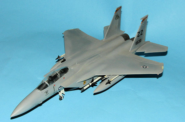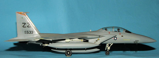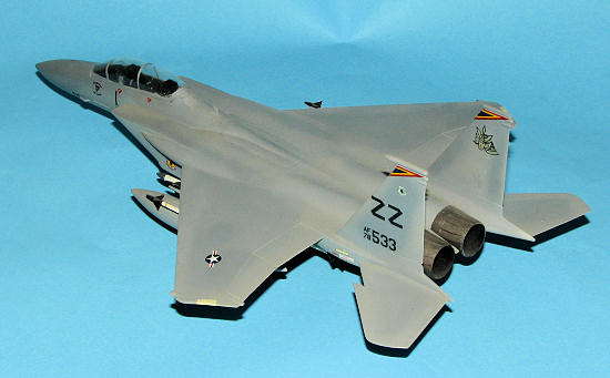 Anyway, I chose a set of markings for an F-15C attached to the 18th TFW in Okinawa. The decals went on quite well with no hassles and while a bit thick and not as crisp as modern ones, looked fine to me. I used Detail and Scale's 1/72 Slime Light sheet for the formation lights. I should point out that at the time, I wasn't the least bit concerned that I was putting F-15C single seat serial numbers on a two seat F-15B and calling it an F-15D. Of course today, such a thing would keep me up nights. A nice misting of Future and Tamiya matte base (yep, I was using that mixture way back then) sealed in the markings and made things way too matte