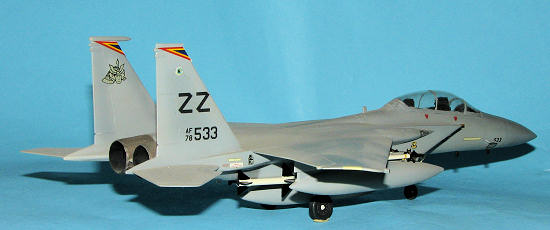 Eagles are generally pretty boring aircraft to look at. This one was an earlier version so was painted in the two Compass Ghost Grey colors. I was using Gunze paints at the time and sprayed those on. These two shades are very close to each other so it is difficult to notice them on the finished model. The large area below the afterburners was painted using Testors A