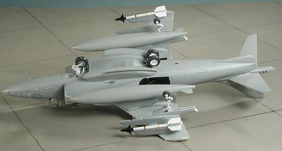 The kit was then given a cleanup to get rid of any decal solvent or glue residue. Then I plugged in the forward and aft nozzles, glued on the various pylons, attached the Sidewinders (one of which suffered a broken fin somewhere along the way) and drop tanks, and gave the kit an overall coat of matte clear. Harriers are not supersonic in any way, shape or form so a very matte scheme is quite normal. I also did some accentuating of controls with an artist's pen as usual. I'd thought of adding some exhaust grunge, but really, the Harrier isn't as filthy in that regard as, say, the Phantom (of course, it doesn't sound as glorious, either!).