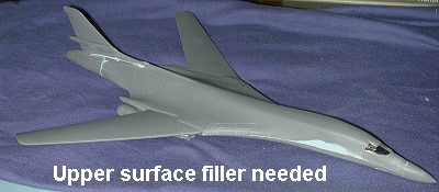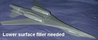 Not so easy, that last question. There were times (fade back to a youth of 29 cent models and no color TV) when stands were (no pun intended) standard equipment in a model. In fact, several of the Comet, Aurora and Revell kits then available did not come with any landing gear and had the doors molded in the closed position. Fortunately, I also build airliners from time to time and several of them still provide stands that will work well on a 1/144 B-1. Test fitting showed that the gear doors fit fairly well and I really wasn't looking forward to trying to paint those rather pathetic wheels.