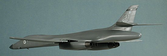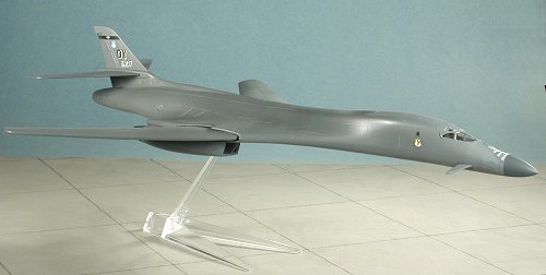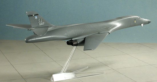 Paint for this one is deucedly simple. It is a single color. Now the instructions tell you to paint it FS 36375. WRONG!! The actual color is FS 36118 (thanks for all the e-mails, folks), though actually it is actually more of a semi-matte on freshly painted aircraft. However, when I've used 36118, it has turned out way too light (see the F-15E review. FS 36081 is the color recommended in the 'B-1 in Action' book (my only reference on the type) and that is what I used on this one. In retrospective, perhaps I should have used RLM 66 overall! Since it is an overall scheme, painting is really quite easy. Now as you can see by the picture above, the radome is also this color on this particular plane. However, on others it is a darker grey. I sprayed the nose RLM 66 and when it was dry, masked it off and painted the rest of the airframe Gunze FS 16081 acrylic. That gave me a nice, gloss surface for decals. The only other color used was Testors Metallizer Burnt Iron for the exhaust. Markings are for the 9th BS/7 BW at Dyess AFB and for the 128 BS of the Georgia ANG, a unit that is either no longer flying the plane or is about to trade them in for something more docile, like C-130s. I chose the 9 BS ones, mainly because it had a more colorful tail marking. MOUNTING The last thing to do for the model was to find a way to display it. I'd already built it wheels up, so I went through my junk drawer in search for a stand. Fortunately, I build airliners as well so had several Hasegawa 1/200 stands. But what really caught my attention was a stand from a Tamiya 1/72 Bf-109E kit. It was clear and just looked right. After gluing the arm to the base, I went about determining just where the center of gravity was on the kit. Once that was determined, a small slot was cut into the bottom of the model until I could just force the stand into place. That was it and the model was done. Just a note that the plane is very 'wiggly' on the Tamiya stand and really needs something a bit more substantial.