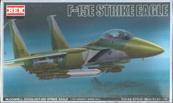 Ben is one of a myriad of Japanese companies that seems to come and go at will. Their sole claim to fame is that they have reboxed Tamiya 1/100 kits. In the interim, they have produced a few kits of their own, though I suspect it is more of a modification of some other models. The only 1/100 F-15 previously done was boxed by Entex, though its origin is steeped in mystery. However, the Entex kit was the prototype Eagle and a single seat plane so this may be an all new mold.