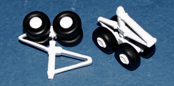 When those were dry and settled enough to handle, I attached the landing gear. The nose gear had been glued in for quite a while, so I just glued on the nose wheels. The openings for these are considerably larger than the axle, so I needed to use accelerator on the glue. Be sure to leave a bit of a stub sticking out.