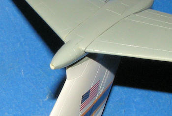 Next were the engines. Fit here is as to be expected. They don't fit well and the angle is decidedly 'downhill'. Again, because of time constraints, I did nothing to fix this, but it does require reshaping of each of the upper portions of the engine pylon in order to remove the nose down attitude of the engines. This should also help to get rid of the gap that is there in the stock position. The last steps were to attach the tail planes, which actually fit rather well, and then glue on the pitot tube. I then removed the masking from the windscreens and that was it.