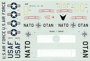 The instructions are the standard pictorial diagram with colors given in generic terms. The 18 construction steps are well done and should provide no problems. Decals are provided for two aircraft. Both are in grey with white control surfaces. I'm not sure just what shade this grey is, but I'd use ADC grey as it seems the most likely. Markings are for a generic USAF version and for one of the NATO operated aircraft. From my limited experience with AWACS aircraft, about the only color that they have carried has been a colored tail band. There was one very pretty boss bird for the 552nd Wing, but I seriously doubt if you'll ever find aftermarket decals for this plane. The kit decals are well printed and appear to be very nice.