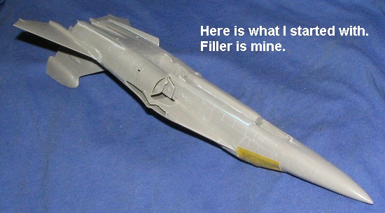 than the interior so the wheel wells and intakes were in bare plastic. The builder had tried to fix seams by putting super glue on them and hadn't sanded them down. There were places on the airframe were glue had dripped, causing some damage to detail. The builder had also glued on the horizontal stabilizers, something that I never attach until near the end of the build. What's more, the seams under them had not been even filed down and so filling them was near impossible. The two wings had also been constructed.