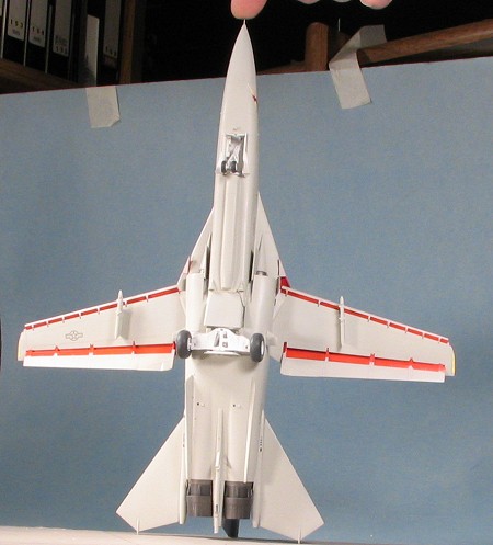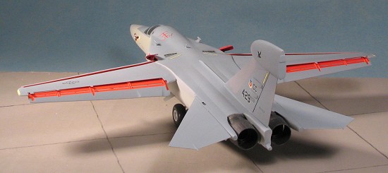 Not really that much to do for final construction. I did glue the wings in place as I didn't like that they were a touch loose. I also glued on the burner cans and added some color on the wing tips for formation lights. The nose probe and all the clear bits had gone missing so no landing lights (the canopy was already glued in place when I got the kit, if you recall). I used two sizes of stainless tubing to make a new nose pitot and it looks a lot better than the plastic one anyway. Still no idea of how to do the GPS antenna on the nose so I left it off. I also left off the drop tanks as the instructions didn't even mention them. Not sure just what is supposed to be on those pylons, but they look a bit lonely with nothing on them. I popped off the masking and that was it.
