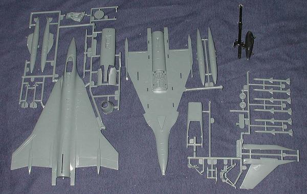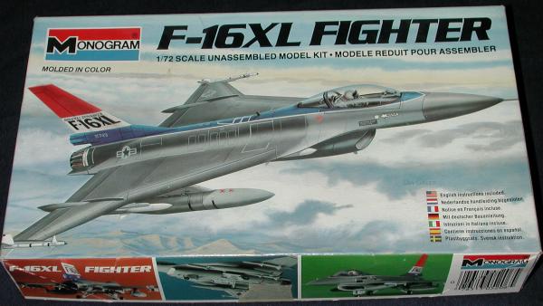 The F-16XL kit is very much a Monogram kit. It has raised panel lines, and generally good overall detailing. The cockpit has the seat integrated with the tub and raised detail on the consoles. The instrument panel is molded with the upper fuselage half and you are given a pilot figure. Wheel well detail is also fairly good. A full weapons load of two Sidewinders and six AMRAAMs is included. Monogram has thoughtfully opened all the holes in the underside of the wing for these missiles and for the two wing drop tanks. The canopy is a heavily darkened single piece construct.