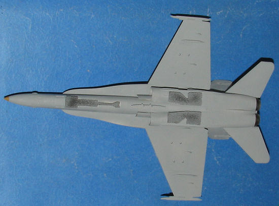 The last things to do were to install the wheels, gear doors and things that dangle under the plane. The gear doors have a huge tab on them and are a very tight fit so take care not to give too much 'oomph' or you'll break one. Trust me on this. The fuel tanks were glued to the pylons and the wing pylons were simply pushed into place as the fit is quite tight. It was then that I noticed something was not right. Hobby Boss had decided that the Hornet was land based and neglected to provide a tail hook! Rather odd omission considering one has to install the 'beware hook' decal on the back. I have to say that all the ones I have in the spares box were no where near as beefy as what was needed for this project so it was left off. I removed the masking and that was it.