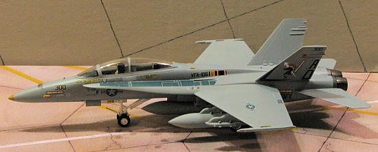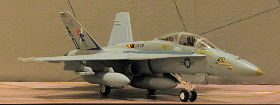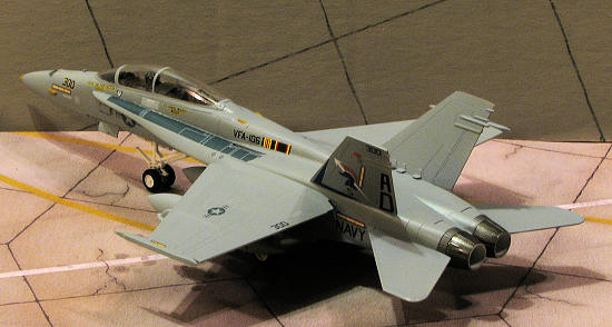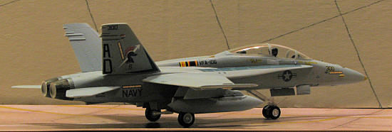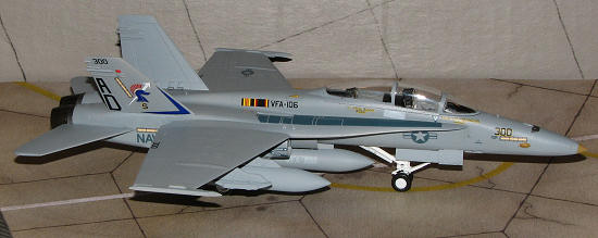 Instructions are basically four diagrams to show where the bits go, each diagram with a few more bits on it than the one before. Color information is Gunze reference with generic names on the nicely done full color painting and markings guide. I believe the greys are FS 36320 upper and 36375 underside, not the highly contrasted shades shown. The decals are superbly printed and while others have commented on difficulty with them, I've not experienced that. Markings are for two planes. One is the box art plane for VFA-106 and fortunately the insignia on the sheet are not as distorted as those shown on the box or drawing. The other is the boss plane for VMFA-225. There are also a number of very nicely done aftermarket sheets that have F-18D options on them.