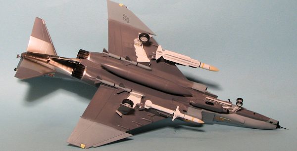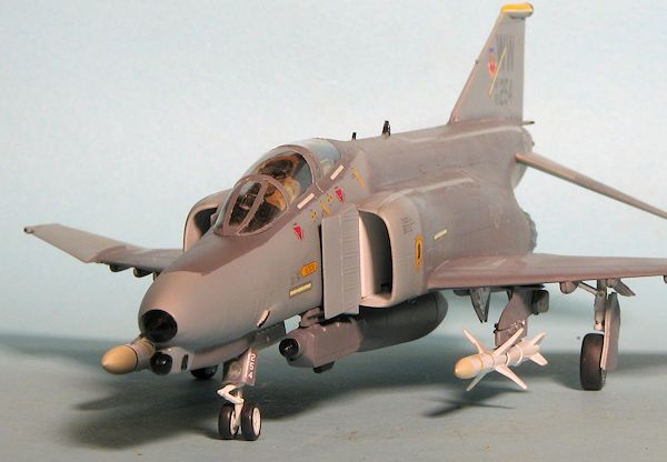 Then I went back and applied the gear doors and hinges. These Phantoms also have a lot of small antennas so those were attached as well. I then put some stripes on the white painted missiles and attached those. The stripe sequence is bogus as I do not have all the colors and widths required in my stripes stash. I then scrounged some Sparrows from the 'Phantom bits' box, painted them up and glued them in place. The final touch up painting took longer than I'd have thought, but eventually it was done. The model was given some semi-gloss clear to cut back on some of the shine, the exhaust, centerline tank, and stabs glued on, the masking removed and I was done.