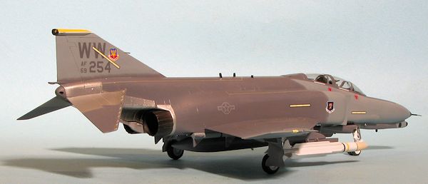 For the F-4G, like the later F-4Es, there are leading edge slats so the wings need the holes in the lower section opened to accept the slat actuators. The kit includes nicely done landing gear and has both wing and centerline tanks. There are weapons racks for Sidewinders on the inner pylons, but no weapons. Since the F-4G carried anti-radiation missiles, these racks are not appropriate, though the pylons are. Hasegawa has the proper missiles in their weapons sets. The kit decals are supposed to be for two planes: one is the boss bird of the 37th TFW in the Hill Grey II scheme while the other is a shark mouth aircraft of the 23 TFS/52 TFW in the Euro I wrap scheme.
