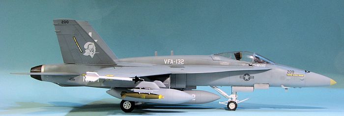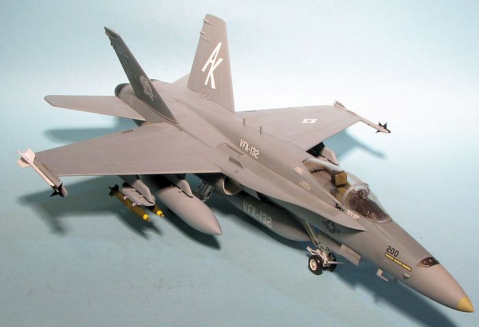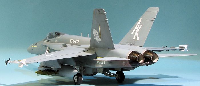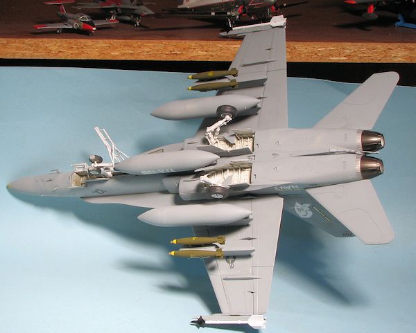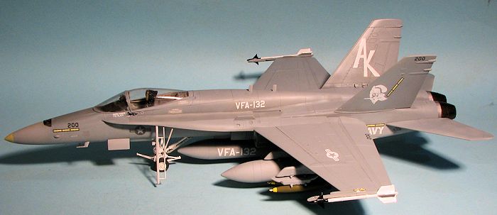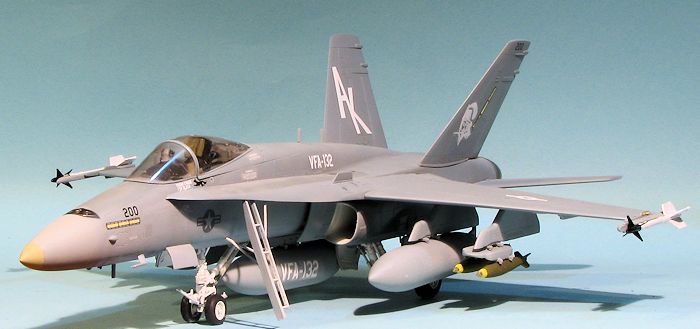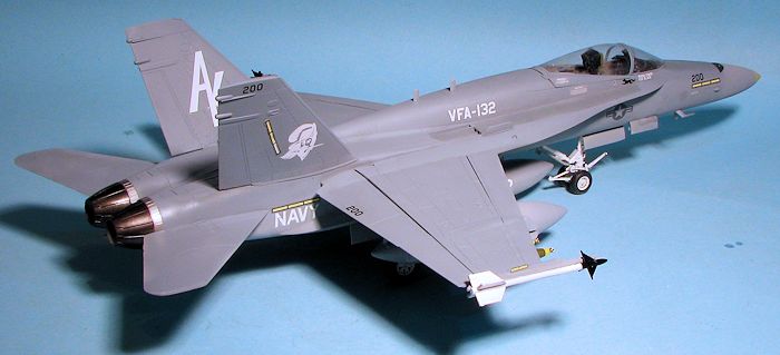 Eventually, I had a relatively complete airframe. I left off all the antennas and the stabilators until after painting. I should mention at this time that Hobby Boss wants you to install all the various antennas that make an F-18C, so you need to leave those off. There are also antennas molded on the right forward nose gear door that should be sanded away. I am pretty sure I did not get all the C mods removed, but I think I got most of them. Fortunately, the fins are the proper ones as they are the largest visual clue.