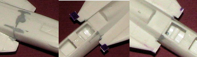 With all the markings in place, I glued on the exhaust cones. These are too small for the mating surface. The tail hook was the l