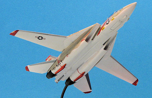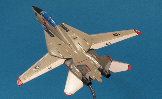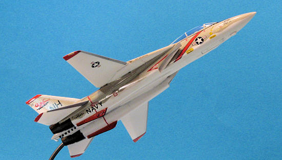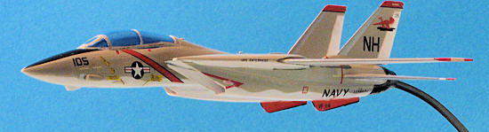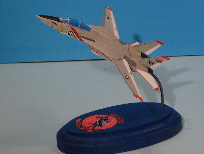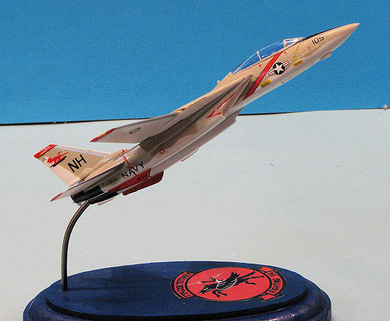 I then bent a section of 3/32 piano wire (try it, it isn't easy) into a slight curve, drilled out the hole in the exhaust to match and drilled a hole to match in a cheap wooden base. This base was painted a nice blue color. The aircraft was cemented in place in an appropriate attitude. I scanned a VF-114 patch, printed it out and attached it to the base using clear gloss paint. Tacky? Perhaps, but it is better than nothing.