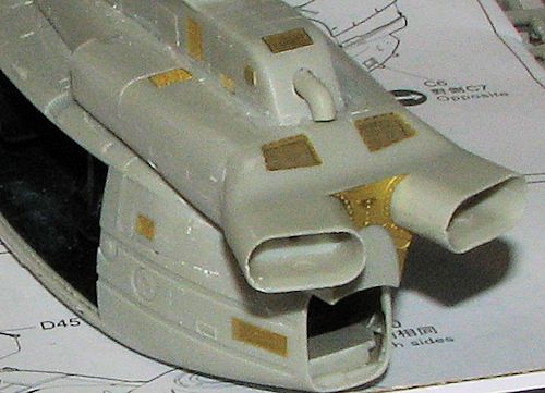 piece was either short shot or damaged as two small pieces were missing. I'll have to replace them with card as they provide a framework for an insert. When that was installed, I installed the engine cover doors. As usual when a kit is designed to have these things open, it took a bit of trimming to get these to fit closed. Meanwhile, I added more p.e. to the boom and to the fuselage section. A situation I ran into regarding the p.e. screens is that often, the small ledge they were to fit into was not completely formed. I eventually got all the photo etch installed and then installed the small J shaped exhaust. This is the wrong shape according to the instructions and photos of the real plane. Not sure why it was molded as such, but once dry, the curve was sawed off.