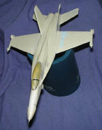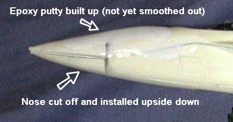 Then it hit me what looked odd about the nose. Anigrand based this kit on an F-18 and the F-18 fuselage is deeper than the YF-17. The kit also has the flat bottom nearly all the way to the tip as in an F-18 while the YF-17 is more curved. I compared the fuselage to the plans provided with the kit and it was obvious. What was also obvious was that the nose cone strakes should be level with the centerline and not curved down as in the kit. Now the quandary as to what to do about it. I certainly wasn't going to cut the fuselage down the centerline to take out the extra depth, but I could do something about the nose.