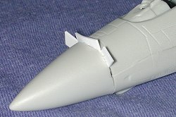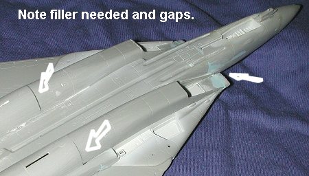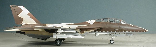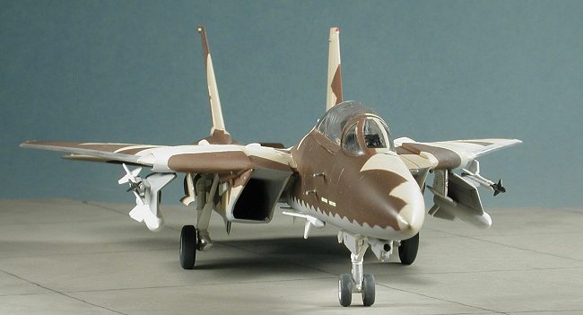 Then it was time to glue the upper and lower fuselage sections together. The method or keeping the wings in place and together is well done and ensures no problems with them 'slipping' during construction. Just make sure that you don't use too much glue on the hold-down caps or the wings won't swing. As was feared, there were some rather large gaps on the side of the aft fuselage just behind the wing openings. These were filled with superglue and when dry, sanded. The small pits were then attacked with filler. Next step was the fins. These fit fairly well, but I'd hesitate to call them perfect. At least they didn't cause me grief! This gave me a pretty complete airframe so I figured it was time to do some painting. I painted the cockpit anti-glare shields black and glued on the windscreen. Then I tacked on the main canopy after sanding down all the ejector pin areas on the lower side. This was then masked. At the lower front, the IR/TV housing was glued in place. I flattened the pointed housing to make it look as if the TV camera was installed. CAMOUFLAGE