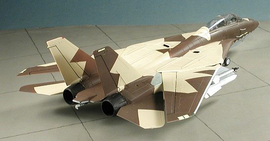 Not wanting to trust the kit decals (as I had no aftermarket replacements for them), I decided that if the kit sucks, then perhaps I can improve things with a neat paint job. For that I chose Two Bobs 48-025 'Sandbox Tomcats' that also includes 1/72 markings (such as they are). Now I didn't always have the exact colors mentioned, so used what was available. For the underside, I painted it FS 36320 as recommended in the instructions. For the sand, I used some 15 year old Gunze Israeli Sand paint that I really needed to get rid of. This required some careful masking and some inventive cutting of tape for the transition line. No way was I going to be able to totally duplicate this wavy pattern as it was very fine in some areas, but I got it close enough. When all that was masked off, I used some Japanese WWII primer brown for the second upper surface color. The paint didn't work 100% because it was acrylics and so I had to patch a few spots where the masking had pulled up the paint. This was mostly on the underside with the grey color.Act