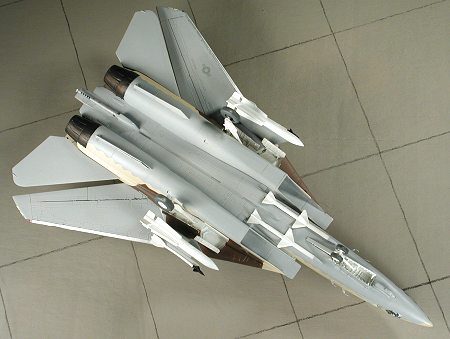 Now that I'd taken care of the more egregious screw-ups on the kit, I coated it with Future to get it ready for the decals. Much to my dismay, the TwoBobs decals proved to be quite brittle. Fortunately, there are not many of them, but I found it impossible to get the wing tip slime lights to cover the curve so I used old Scalemaster ones. I also had the strake decals break into several sections when I FINAL BITS After applying the decals, I sprayed on a clear matte to seal them in. Then the various nose probes were glued on. The instructions are worthless in trying to figure out just where these go and there is no guide on the fuselage to help. Actually, it wouldn't matter as those would have been sanded and filled long ago. The missiles were just painted basic colors and glued in place. These are typically poor as mentioned earlier and all I wanted to do was finish this thing, so no missile markings. The tail hook was glued on and really, that was about it for parts. I used some dull aluminum Bare Metal Foil for the leading edges of the wings. Meanwhile, back in the cockpit, the seats, which had been painted (in probably the wrong colors, but I was past caring), were glued into the tub. Naturally, the front seat is just a touch too tall so the canopy doesn't fit all the way down. I took off the masking from the canopy and called it quits.