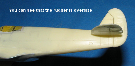The oil cooler and radiator were glued to the underside of the wings and gaps were handled with a couple of Mr Surfacer applications. The rudder was then glued on and it was a bit oversize as you can see. This was sanded down without any problem. With the airframe complete, it was time for paint.
