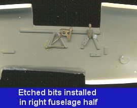 For a kit like this, the first place is the cockpit. This is where much of the etched brass will be place. First, I painted the cockpit plastic bits RLM 02 grey to get an idea of what it would look like. Next, seat and back wall were attached to the cockpit floor, followed by the two resin parts that make up the control column. This was followed by the etched rudder pedals and control cable. The seat had its etched belts attached, but not painted. The right cockpit sidewall gets four controls and indicators of etched brass installed at this time as well. Then the right fuselage half and the cockpit floor get another coat of RLM 02.